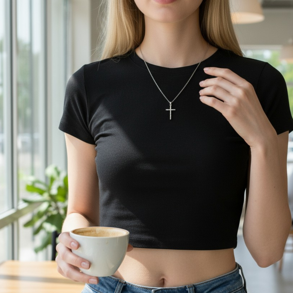 Delicate and radiant, the Starlight Cross Necklace brings a touch of celestial sparkle toyour everyday style. Designed to rest gracefully along the clavicle, it embodies elegance,