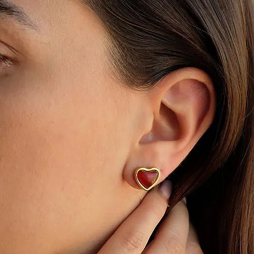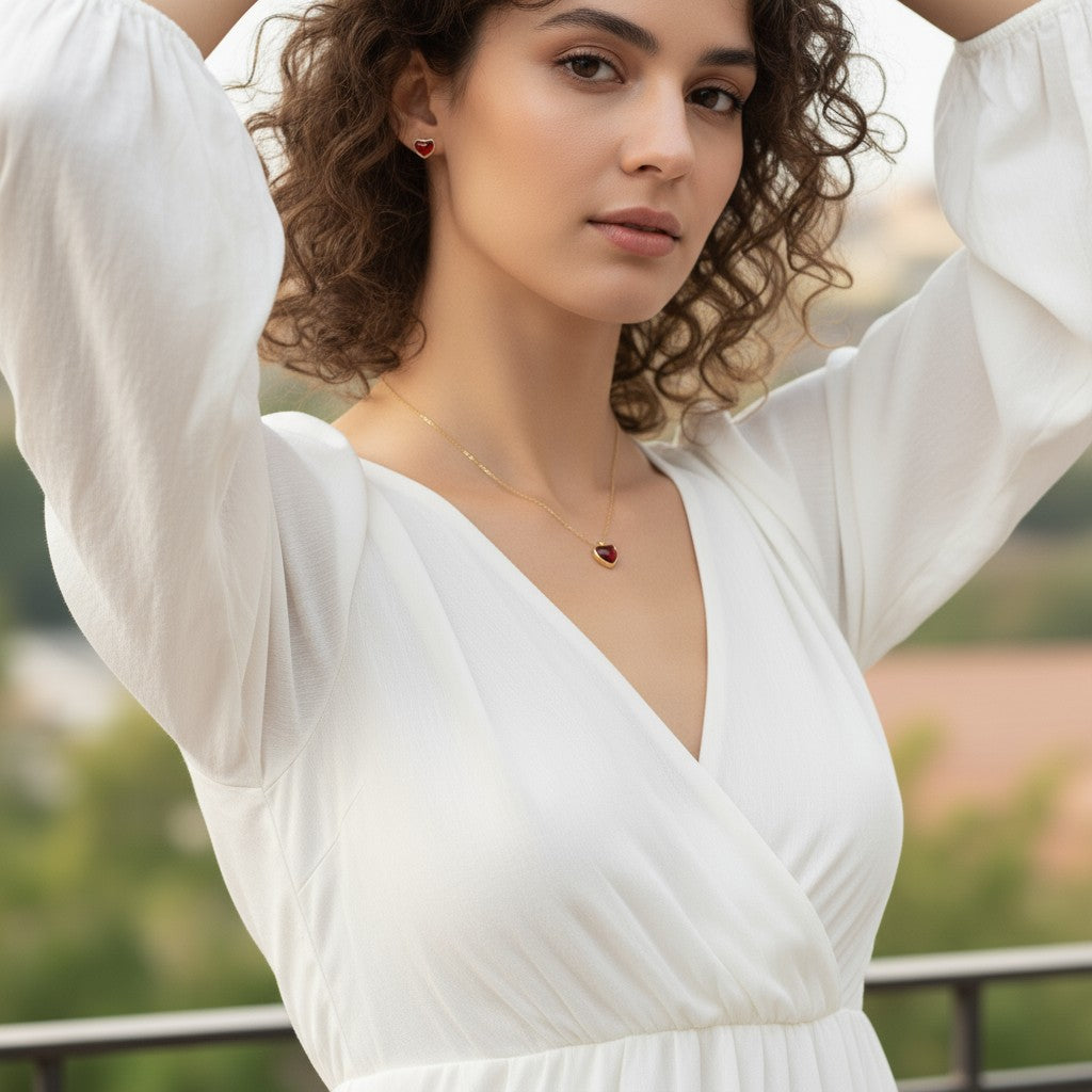 Delicate and radiant, the Blushing heart set features a heart-shaped red agate pendant